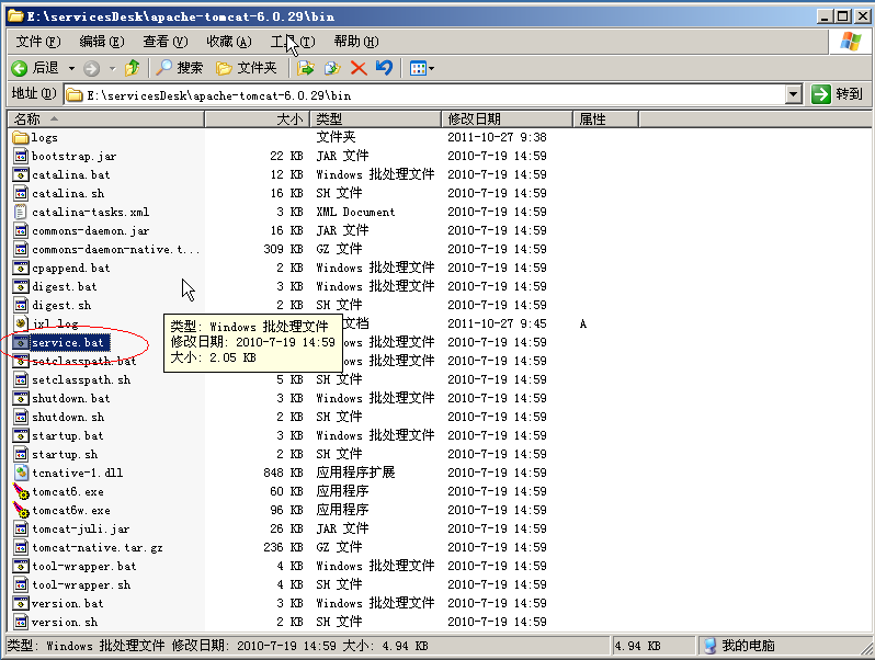 1、首先检查tomcat\bin目录下是否有service.bat文件,如图: