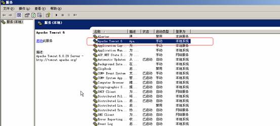 3、开始——运行,输入services.msc打开服务,找到服务Apache Tomcat 6,如图: