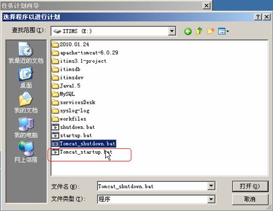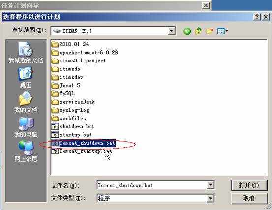 点击浏览,找到要运行的脚本(建议把脚本放在盘符根目录下),这里首先要选择的是关闭tomcat的脚本