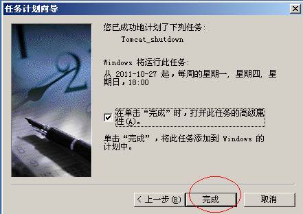 单击完成,即可完成关闭Tomcat服务任务计划的设置。