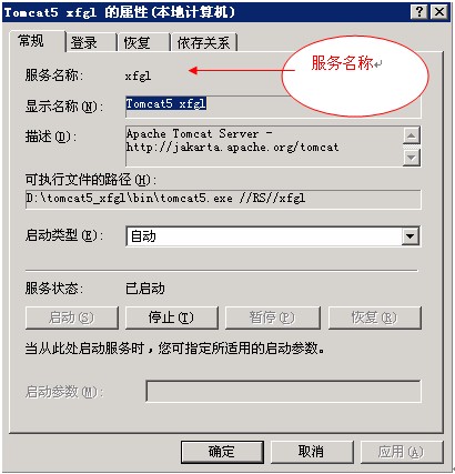 3、进入控制面板->管理工具->服务,在服务列表中找到“tomcat xfgl”一项,双击弹出窗口,把启动类型改为“自动”,确定保存。