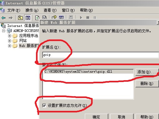 扩展名为GZIP(可随便定义),要求的文件路径是 C:WINDOWSsystem32inetsrvgzip.dll
