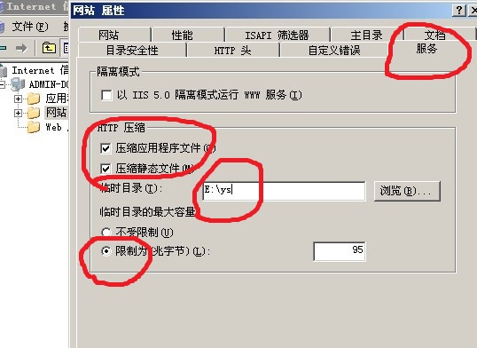 第二:返回IIS服务器主界面,网站-属性-服务.压缩应用程序文件和压缩静态文件勾上.临时目录去硬盘新建一个(最好不要默认目录或者新建在C盘).我的在E盘,新建的ys文件夹.临时目录的最大容量设置成95.这个是M单位的,如果不限制,待一段时间后,网站会变慢变卡.