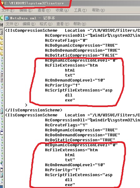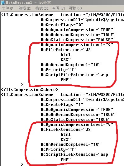 打开 C:WINDOWSsystem32inetsrv目录.用文本模式打开MetaBase.xml文件.搜索 HcDynamicCompressionLevel 如下图,