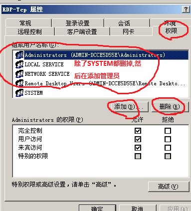 3、权限-删除掉除了SYSTEM的其它用户,然后在添加,你原本服务器上的管理员,默认的是Administrator