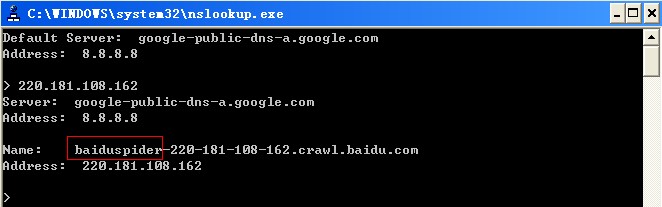 返“Name:baiduspider-***-***-***-***.crawl.baidu.com”有这一行说明是百度的蜘蛛IP。否则为假蜘蛛。