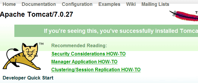 最后进入Tomcat7安装目录下的Bin目录,启动Tomcat,在浏览器中输入:http://localhost:8080/,若可以看到Tomcat7的欢迎界面,表示Tomcat7配置成功了。