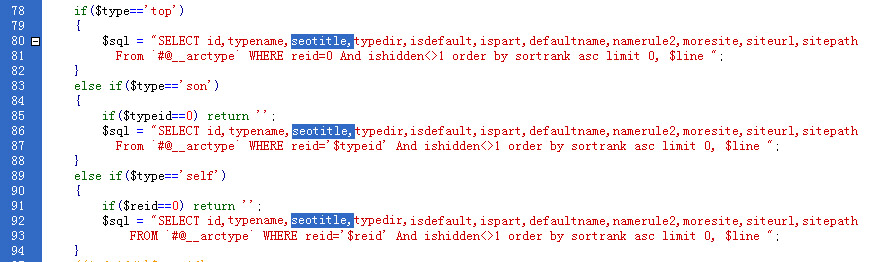 $sql = "SELECT id,typename,typedir,isdefault,ispart,defaultname,namerule2,moresite,siteurl,sitepath