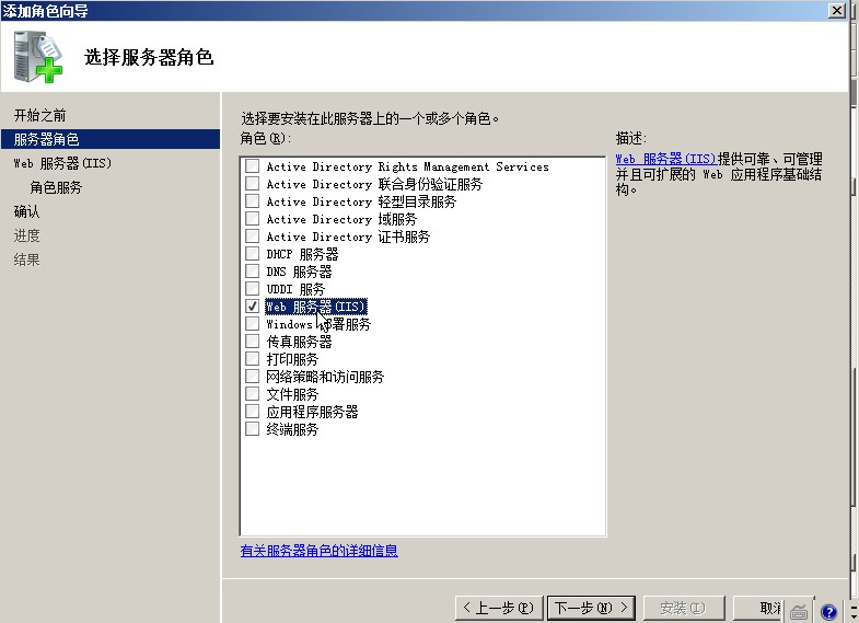 滚动条下翻,或者点击主菜单的“角色”,然后点击“添加角色”,出现向导页面后点击下一步,选择“web服务器(IIS)”(图2)