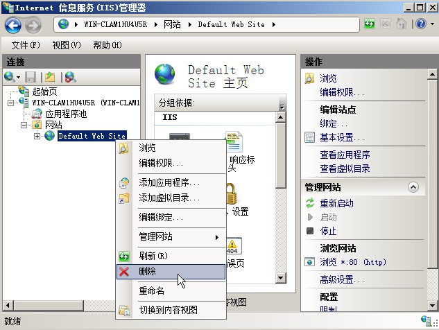 然后删除默认网站,在主菜单中,展开网站菜单,然后再网站名称上右键,点击删除即可(图4)