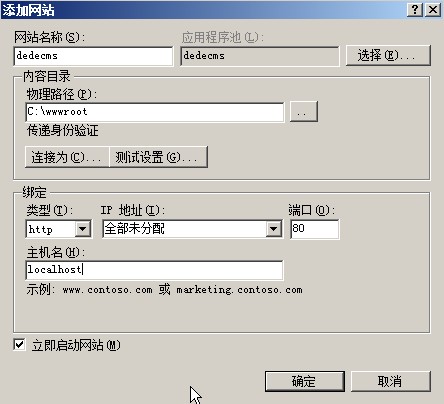 再新建一个网站,在“网站”上右击,点击添加网站,会出现信息网站添加的表单,首先输入网站名称,例如“dedecms”,路径选择为网站存放的路径,单IP的服务器可以不必选择IP,主机头填写为localhost,然后点击确定。