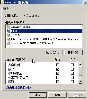 打开“编辑”窗口后点击“添加”按钮。添加一个“IUSR”到权限用户列表中,然后为其勾选除了“完全控制”之外的权限。然后点击“确定”。(图7)