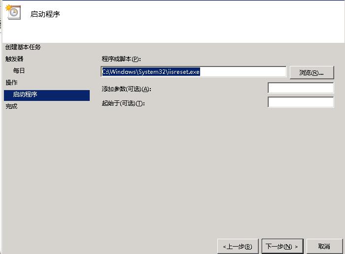 6、点击下一步,进入启动程序设置,点击浏览选择:C:\Windows\System32\iisreset.exe 大家应该知道iisreset.exe是IIS服务器的重启程序。如图所示: