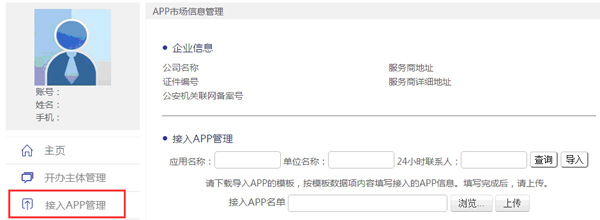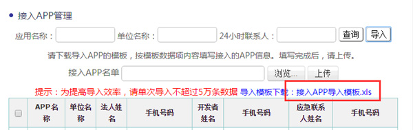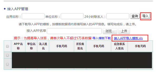 3、接入app管理,点击“导入”,下载”应用商店接入APP导入模板.xls”,填写完成后进行导入。导入时,如果同一个名称有两个app,则前一个导入的app信息,会被后导入的app信息覆盖。