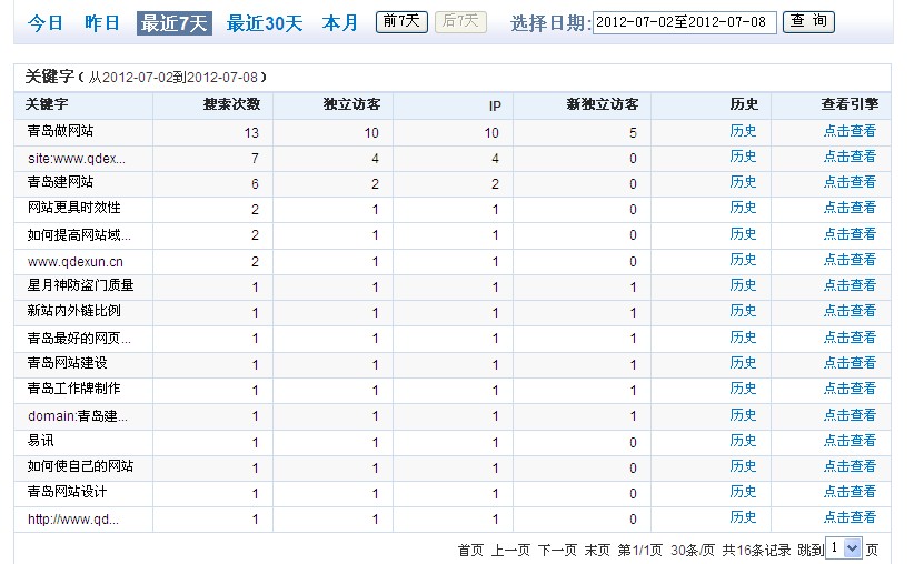 个人认为这是比较好用的,直观清晰,可以查看一个月的主要流量关键词,最近7天的,昨天的,当天的,更可以自己输入想查询的时间。非常方便优化员了解一段时间的关键词变化。