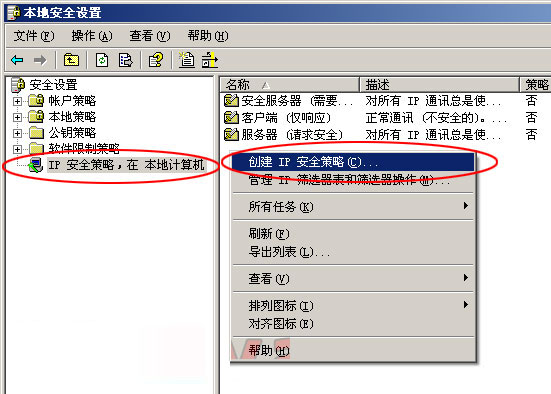 第二步:点“IP安全策略,在本地计算机”,然后在右栏空白处点右键,在弹出的菜单中点“创建IP安全策略(C)”如图: