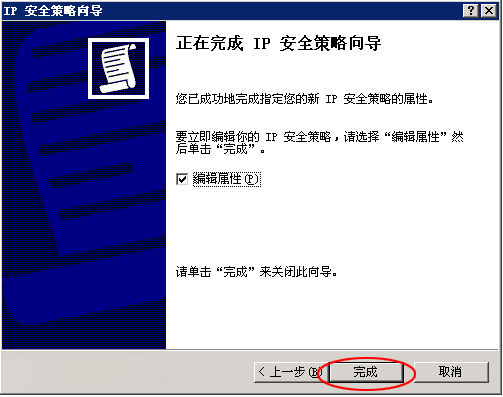 第二十七步:在完成页面点完成,然后跳出新规则属性,点确定,再弹出新IP安全策略