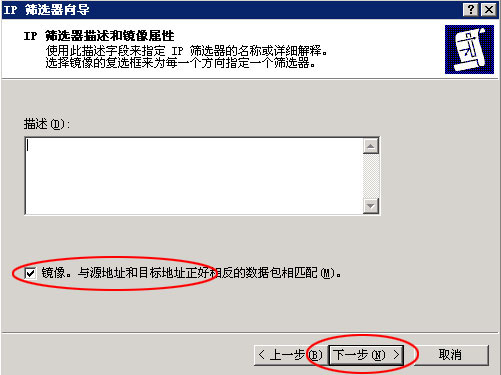 第十六步:在IP筛选器描述和镜像属性中输入描述并选中镜像。然后点下一步