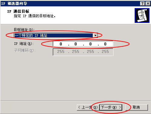 第十八步:在IP通信目标的目标地址中选择“一个特定的IP地址”,把IP地址填写为你要限制的IP,如192.168.0.199,然后点下一步