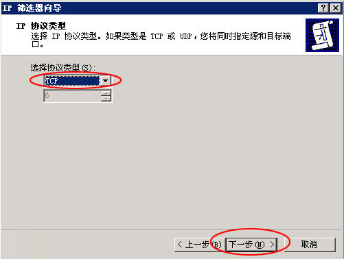 第十九步:在IP协议类型中选择TCP,并点下一步