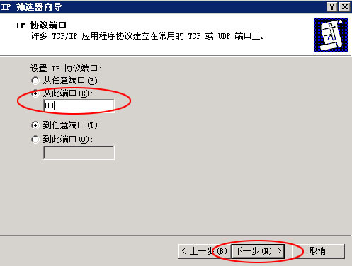 第二十步:在IP协议端口选择从此端口,并填上你要限制的端口,如80,然后点下一步