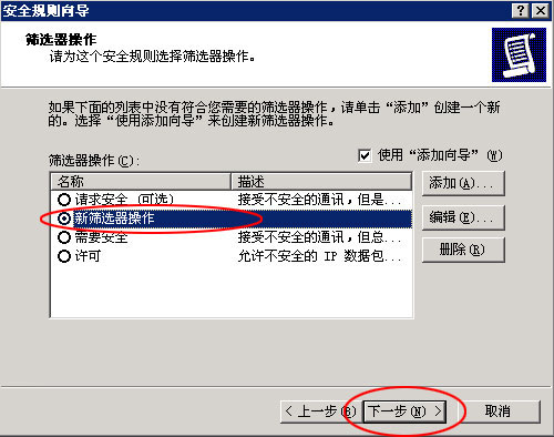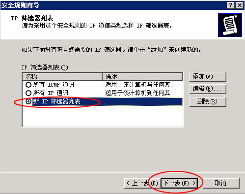 第二十二步:在IP筛选器列表点确定,然后选中“新IP筛选器列表”(刚才创建的),点下一步
