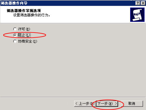 第二十五步:在设置筛选器操作的行为中选择“阻止(L)”,然后点下一步
