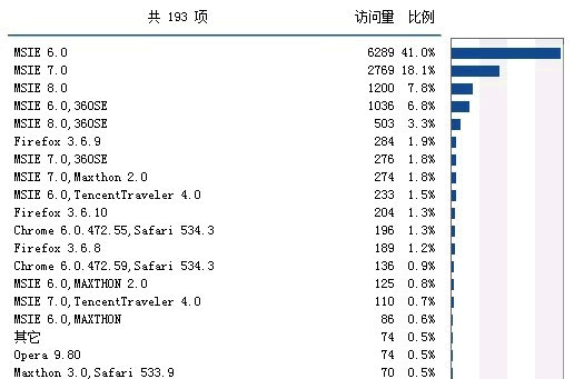 通过以上数据分析得出,访问博客的人依然有70%为IE内核,IE6用户仍然占据41%的比例,所以,在博客模板设计时,我只得在IE6环境下制作,IE7、IE8、火狐为测试环境,通过数据分析,我可以清楚认识到,网页设计到底应该怎么设计,这时如果我加入反IE6联盟,想想会是什么效果?你总不能要求41%的访客为了你升级浏览器吧?像访客的屏幕大小、所在地点、接入商都是很有用的数据,知道那个运营商访客最多,就能清楚是把网站主线路放入电信还是联通线路,甚至是把网站放在用户最多的城市。